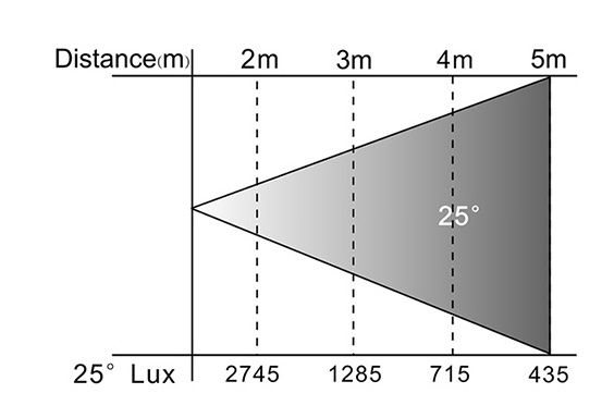 This table illustrates the central illuminance at various distances for a light fixture with a 25° beam angle.